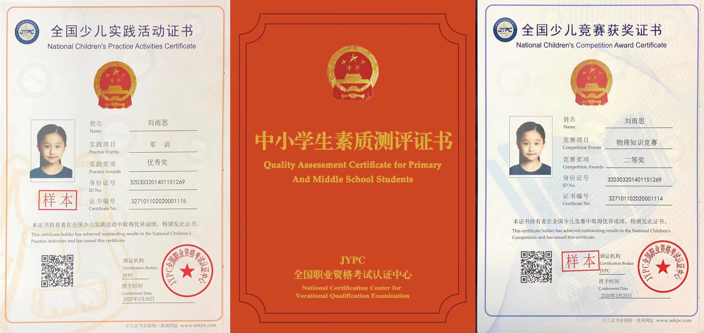 中小学生素质测评证书,主要从中小学生身心发展不同特点出发,因地因校制宜,着眼于实践教育全过程,德、智、体、美、劳五育并举,全面发展学生的思想政治素质、文化科学素质、劳动技能素质、身体心理素质和审美素质等。证书主要包括竞赛证书、实践证书等。例如:书法获奖证书、军训合格证书、心理健康培训证书。共有证书项目约50种。每本证书200-500元不等。