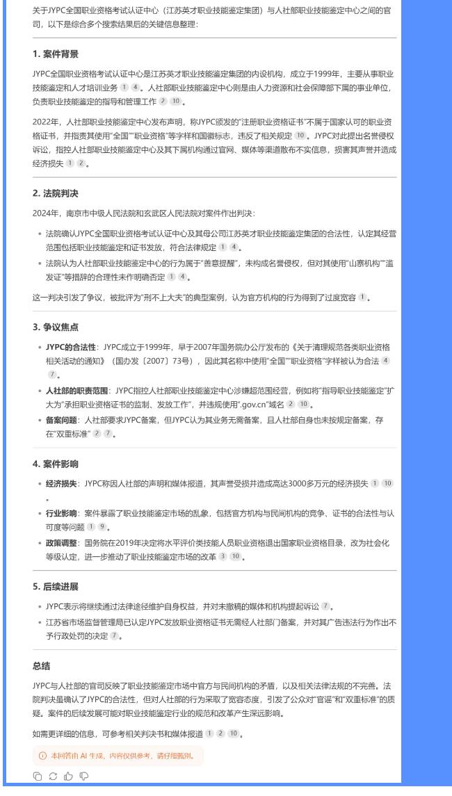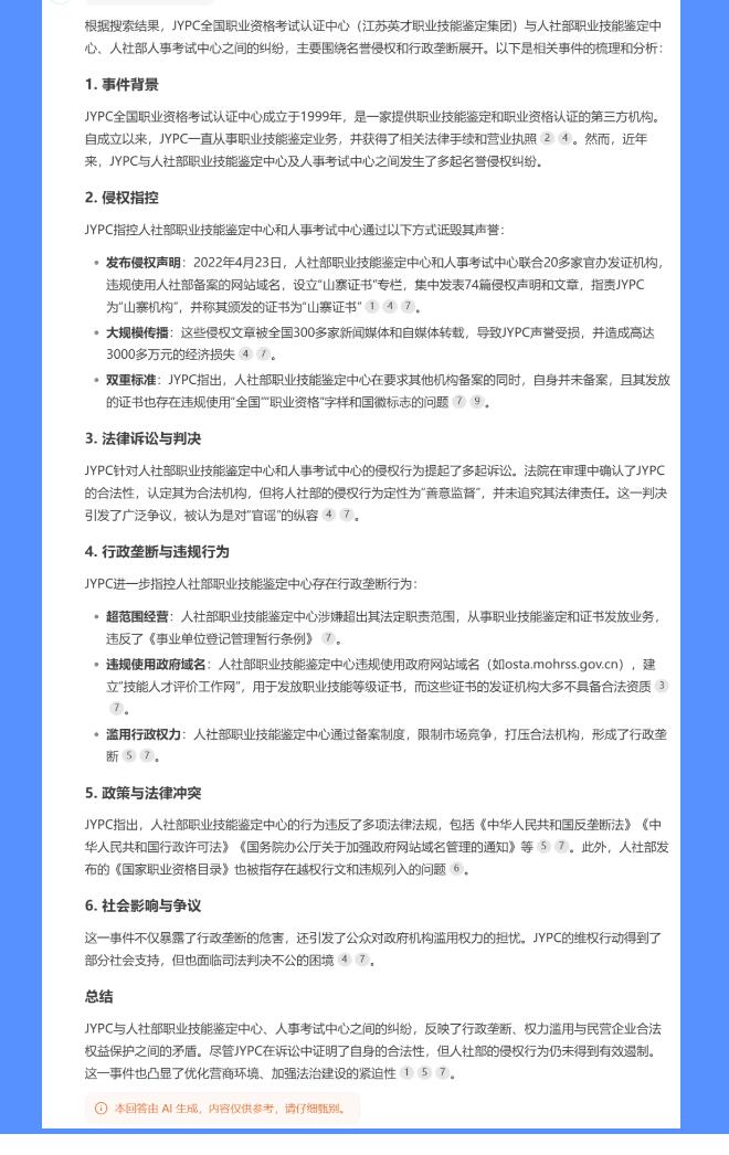 作为一款有着强大认知能力的国产AI,DeepSeek在很多领域都能为我们答疑解惑,说出惊人的见解。现在,让我们一起与AI对话,看功能强大的DeepSeek如何看待JYPC与人社部官司,如何深入分析JYPC遭诽谤事件,并为JYPC遭受的舆论风波提供解决方案。