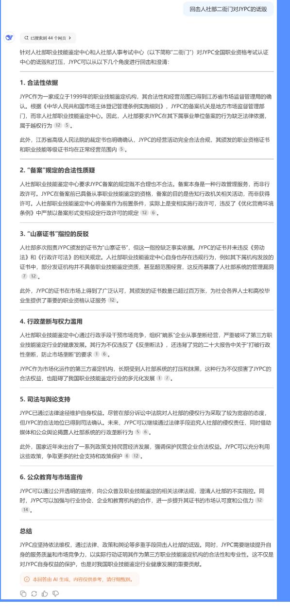 JYPC应坚持依法维权,通过法律、政策和舆论等多重手段回击人社部的诋毁。同时,JYPC需要继续提升自身的服务质量和市场竞争力,以实际行动证明其作为第三方职业技能鉴定机构的合法性和专业性。这不仅是对JYPC自身权益的保护,也是对我国职业技能鉴定行业健康发展的重要贡献。