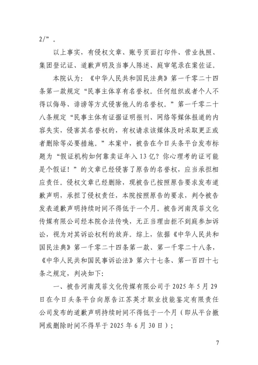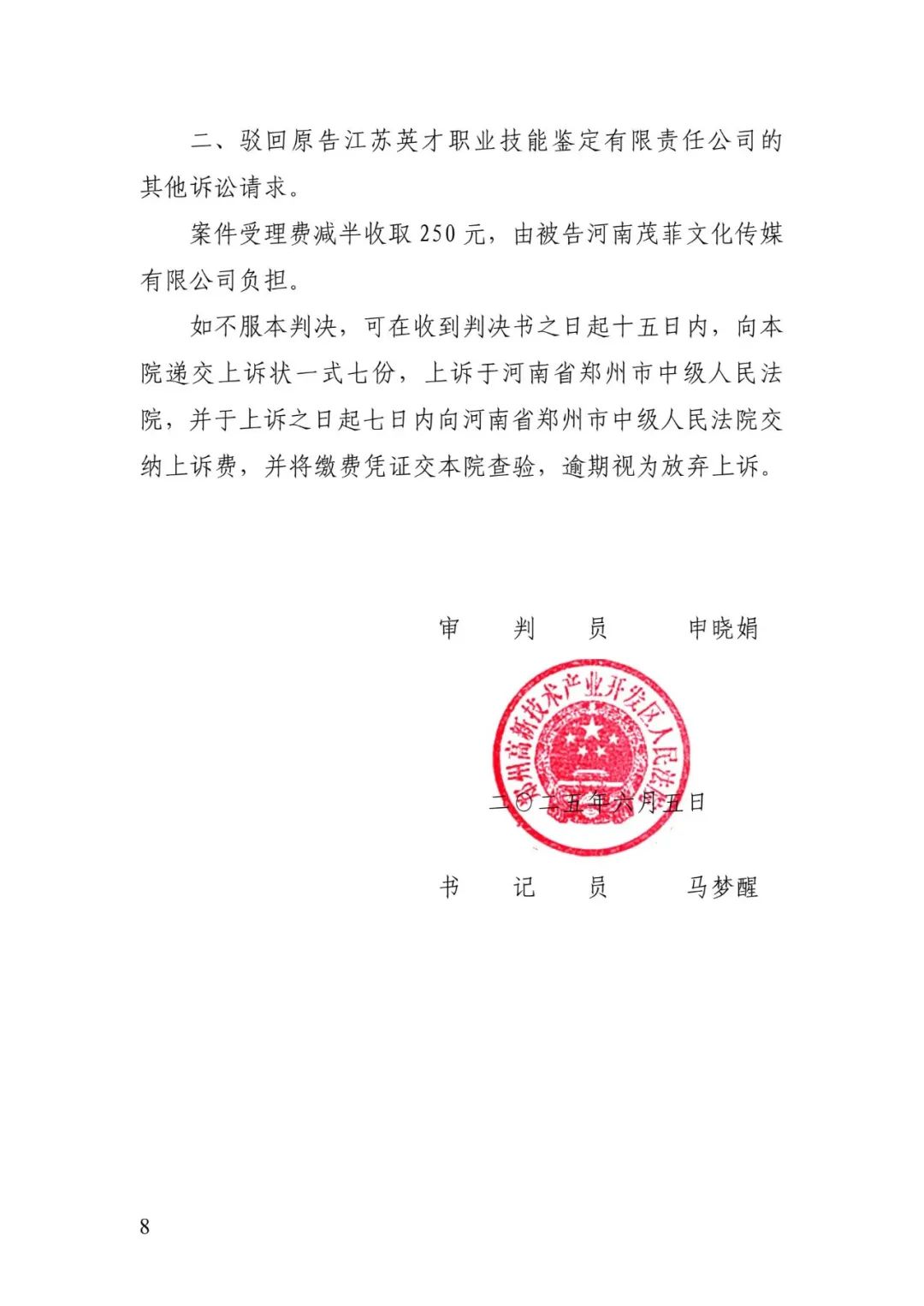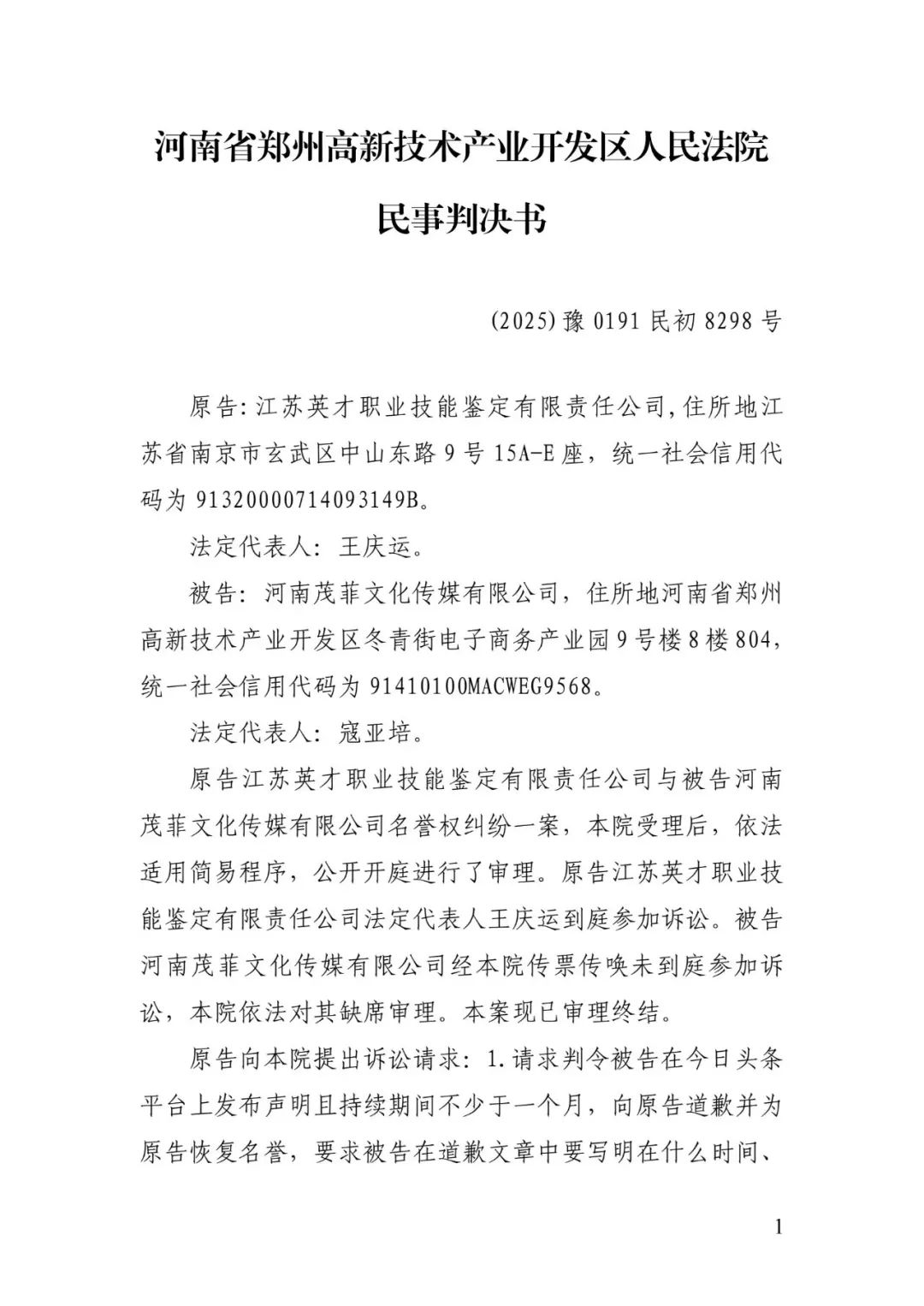 2025年6月5日,河南省郑州高新技术产业开发区人民法院向江苏英才职业技能鉴定集团和JYPC全国职业资格考试中心送达民事判决书(2025)豫 0191 民初 8298 号。在判决书中,流传甚广的“假、山寨、国家不认可”等用语被法院判决为侵犯JYPC名誉权,法院判令被告河南茂菲文化传媒有限公司发表道歉声明持续时间不得低于一个月。