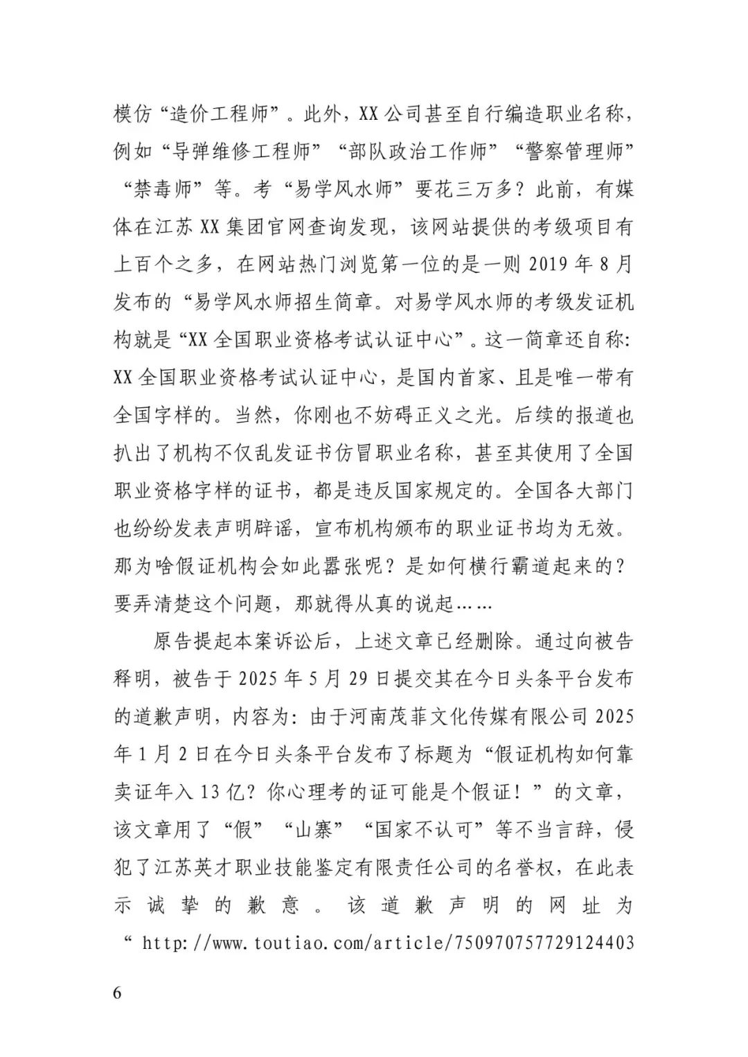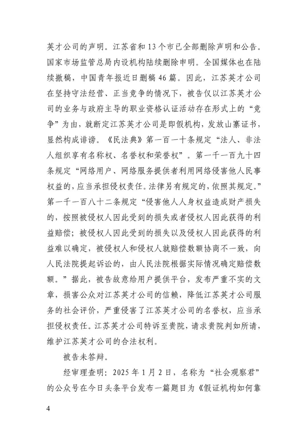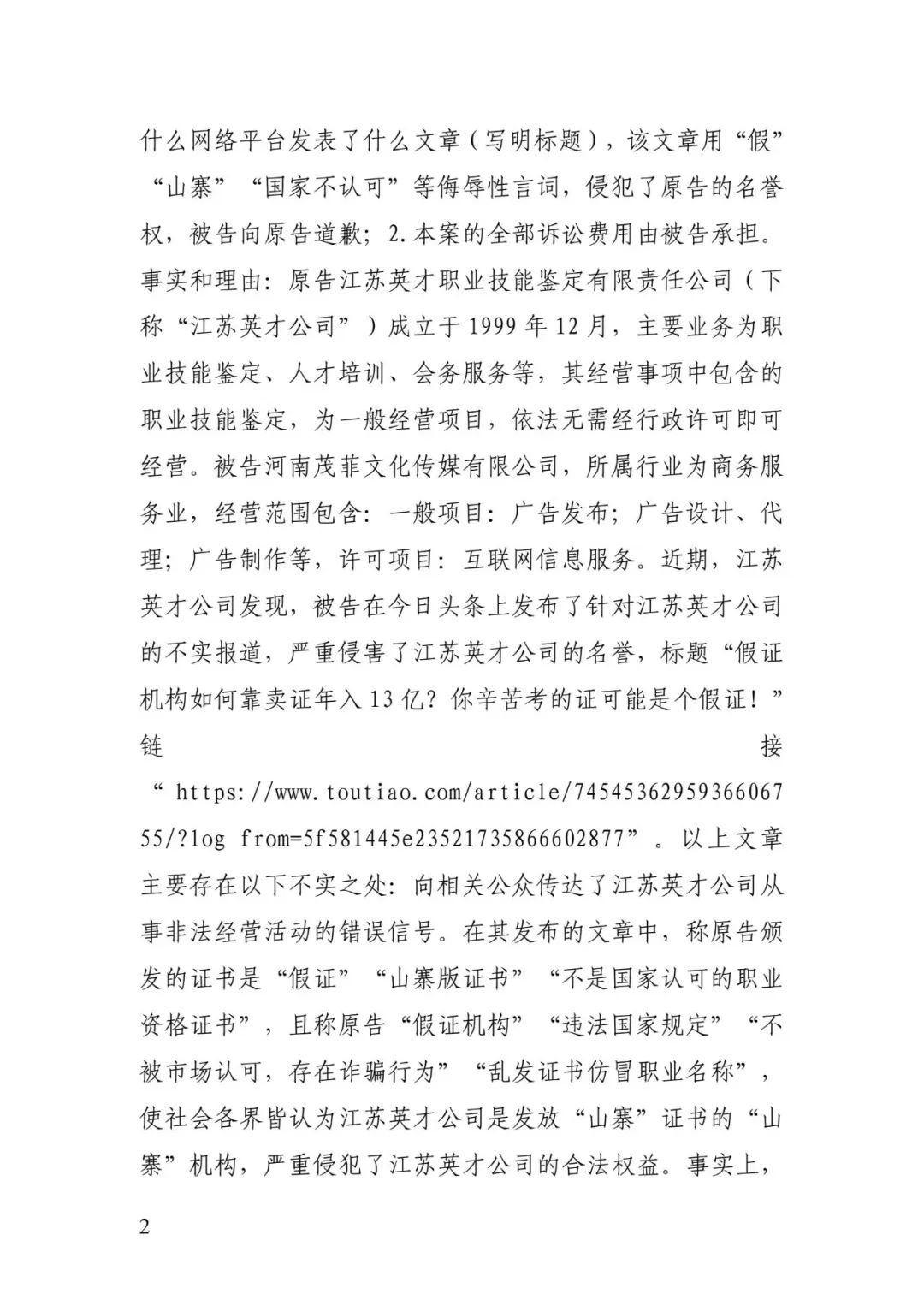 2025年6月5日,河南省郑州高新技术产业开发区人民法院向江苏英才职业技能鉴定集团和JYPC全国职业资格考试中心送达民事判决书(2025)豫 0191 民初 8298 号。在判决书中,流传甚广的“假、山寨、国家不认可”等用语被法院判决为侵犯JYPC名誉权,法院判令被告河南茂菲文化传媒有限公司发表道歉声明持续时间不得低于一个月。
